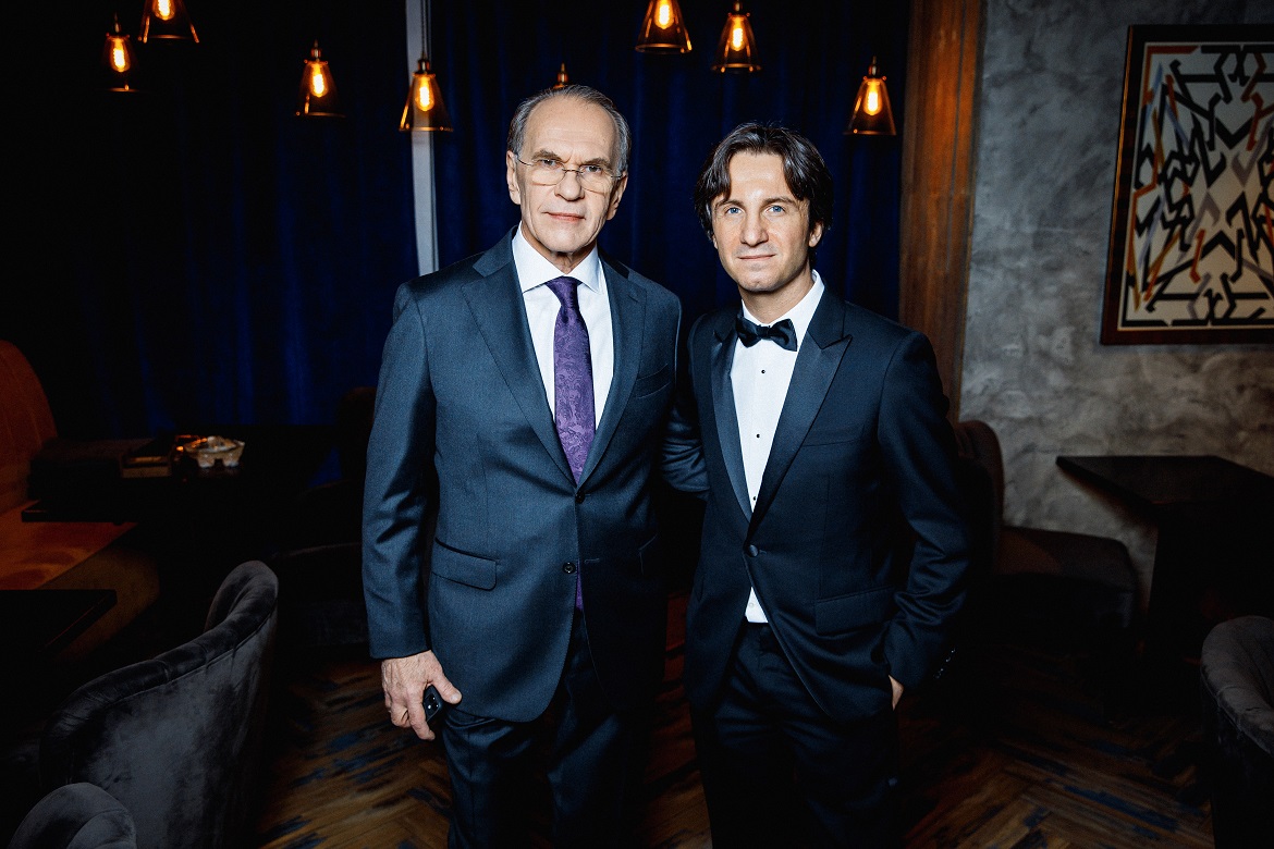 Актер Алексей Гуськов и продюсер Петр Ануров на премьере картины «Серебряные коньки» (2020) в Москве.